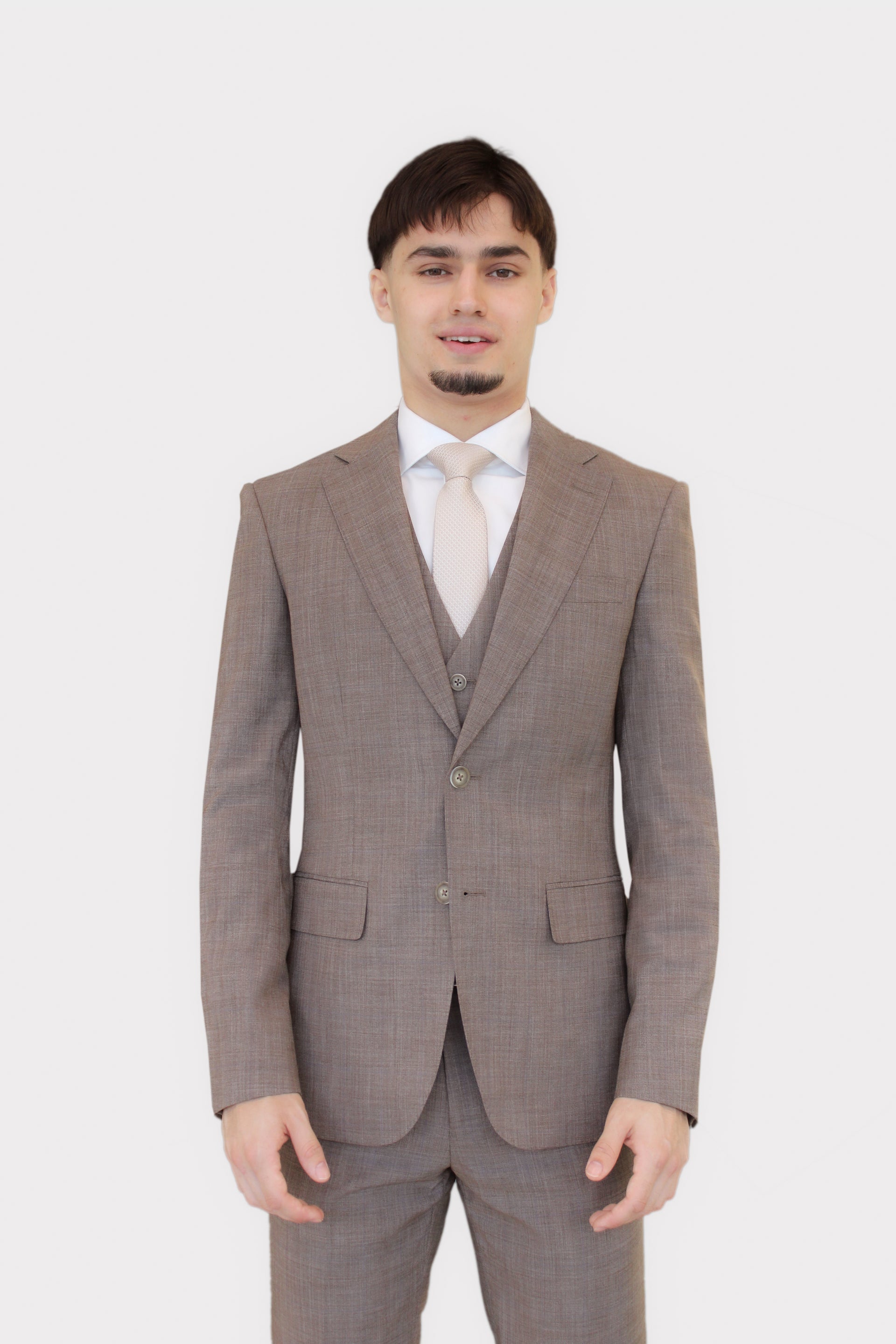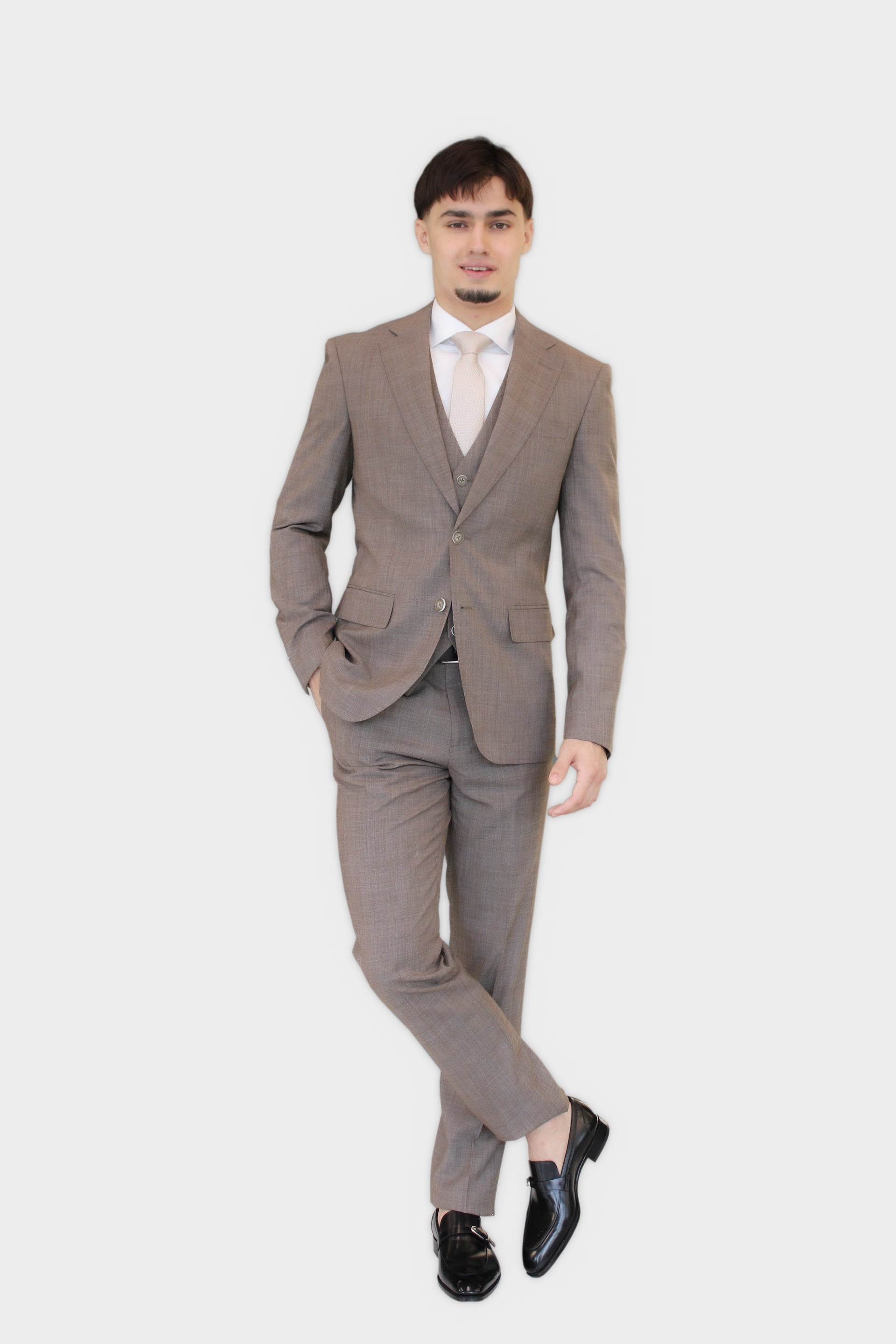 Step out in sophisticated style with The Sandstone Three-Piece Suit. This refined ensemble features a single-breasted jacket, a matching waistcoat, and trousers, all crafted from a unique fabric that presents a nuanced shade of brown with subtle, almost textured flecks, giving it a distinguished, earthy appeal. The jacket is designed with classic notch lapels, a two-button closure, and practical flap pockets, offering a timeless silhouette. The waistcoat provides an extra layer of elegance and warmth, while the trousers complete the sharp, cohesive look. Perfect for spring/summer events, destination weddings, smart casual gatherings, or business wear where a lighter, yet distinguished, colour is desired.